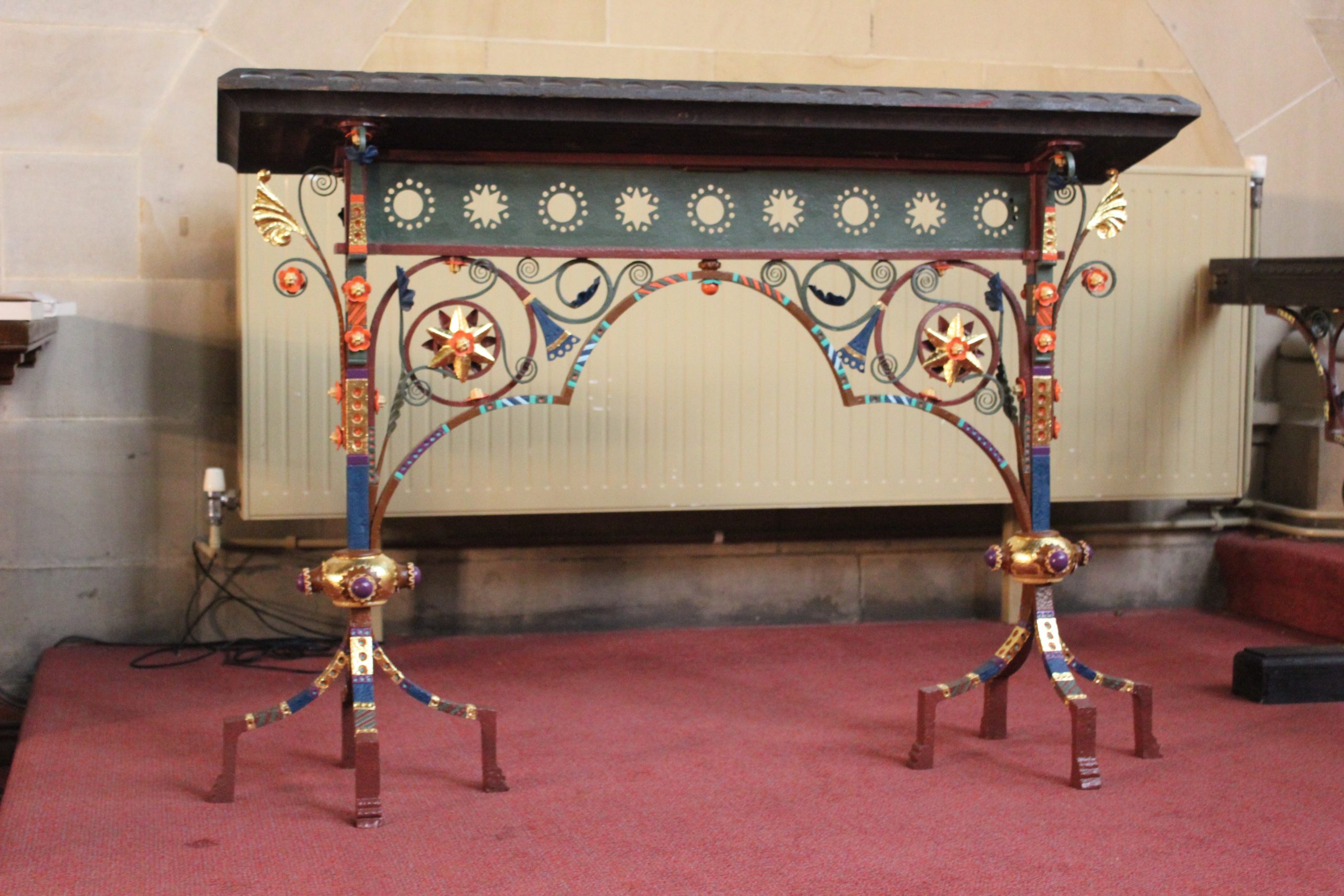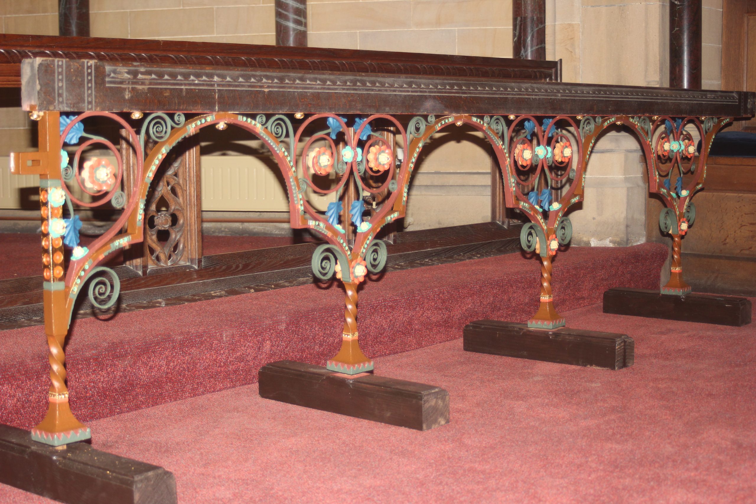 “The Altar rails and Prayer desk seemed to have previously been cleaned and painted black, and were very dirty and rusted. No colours were found on these, so it was decided to establish a colour scheme for them which is in keeping with the pulpit and organ screens.