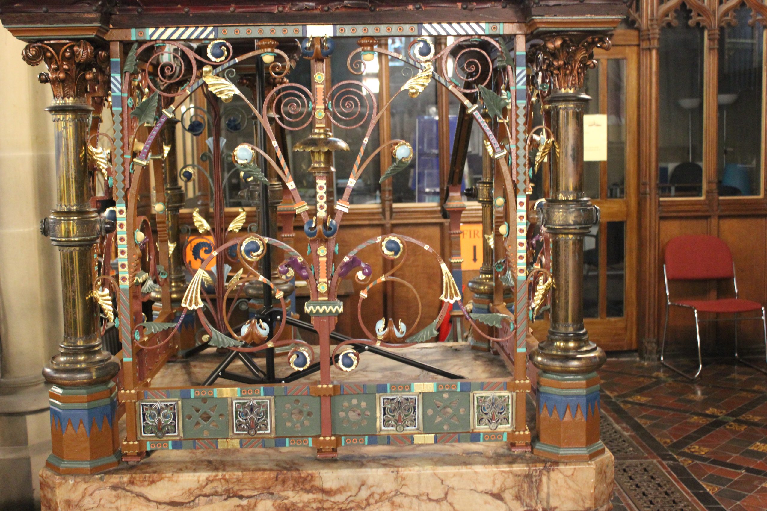 He said: “The ironwork was made in about 1865 by Francis Skidmore from Coventry, and over the years it had been over painted with several different colour schemes to suit the fashion of the times. The latest ‘incarnation’ was a coat of a dull synthetic gold colour which had deteriorated to a not too attractive orange gold colour, and was in need of attention.