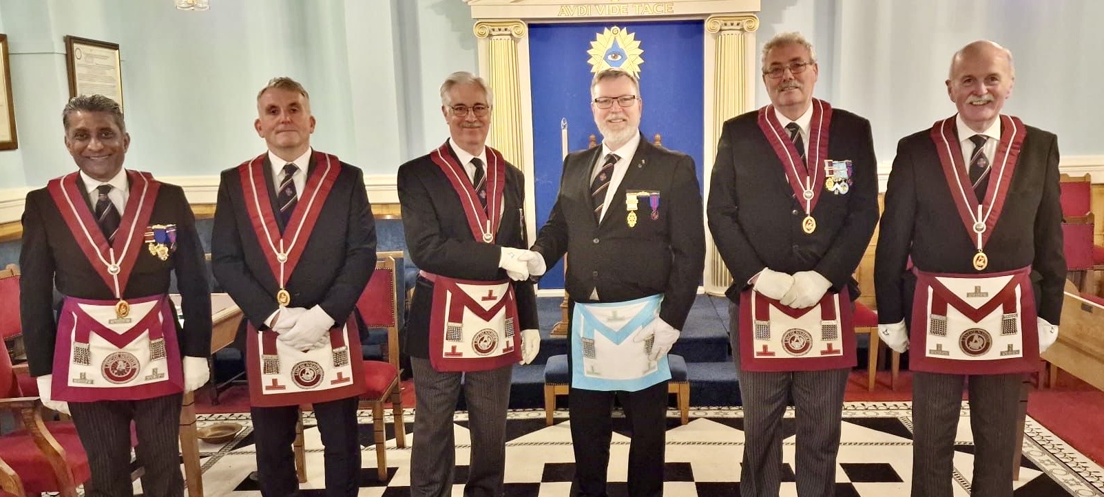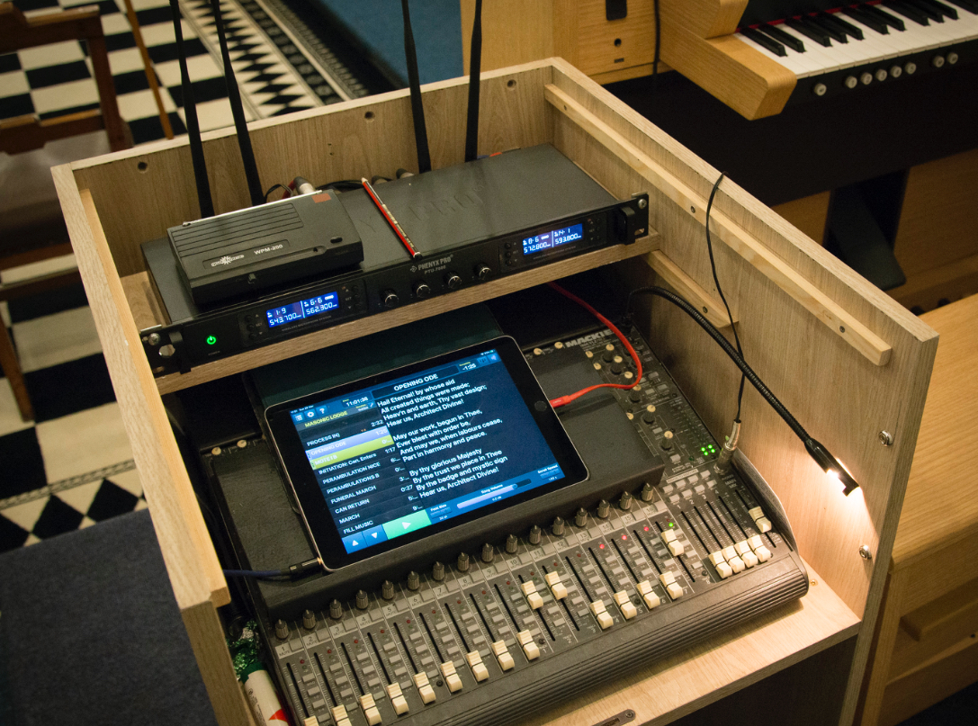 The system has a professional sound desk, a dozen clip-on Lavalier microphones, two mobile microphones to switch on and off, and several static desk microphones. Another feature is its ability to play music for ceremonies when required, including recordings of the Lodge’s own electronic organ thank to Bro Jon Fletcher.