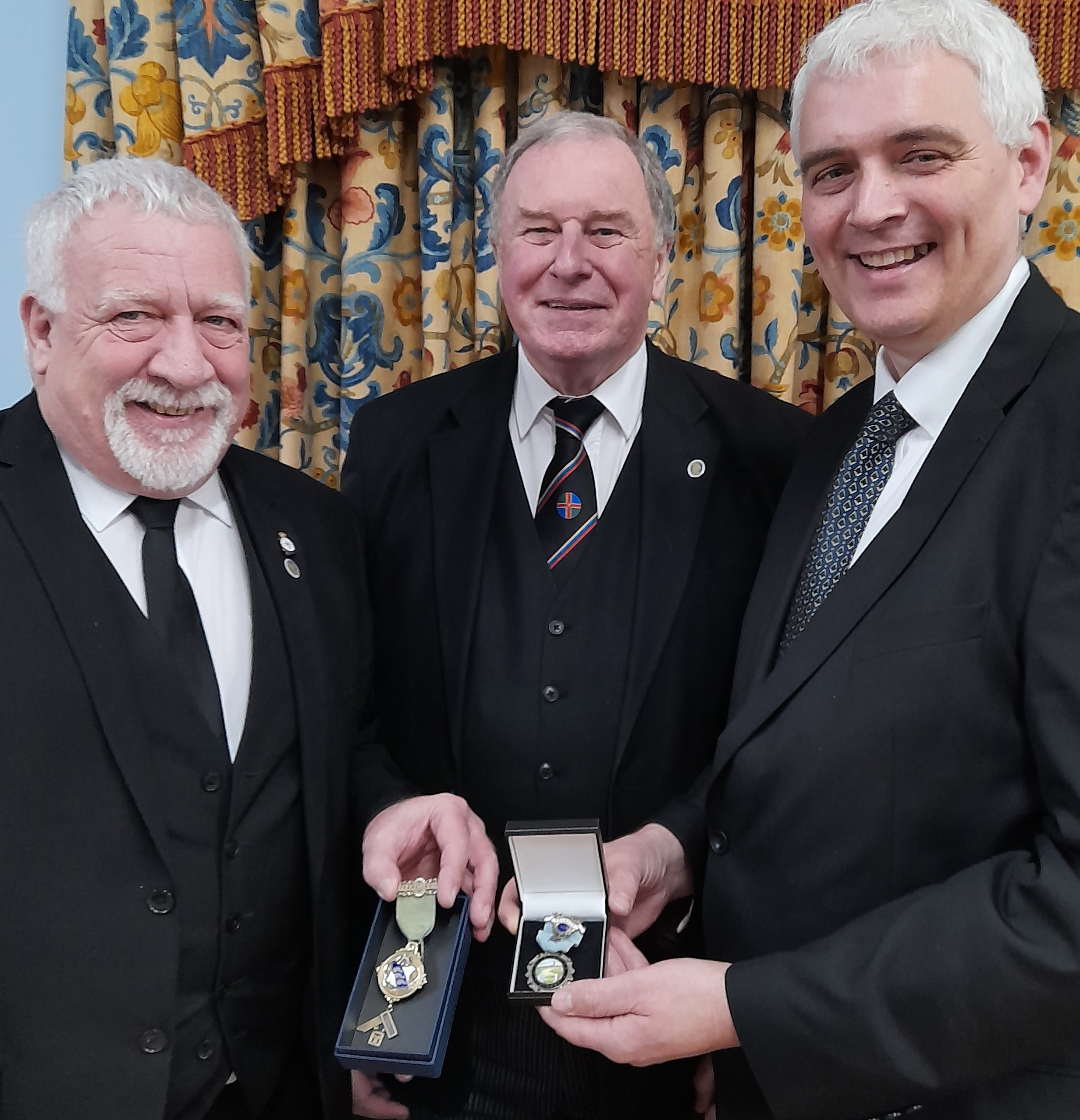 “George, who’s 91 and has just received his 60-year certificate, then discovered a 1909 Franklin Lodge Past Masters jewel also issued to William Steel – the first Asst Secretary of Franklin Lodge. As Lindis Lodge is celebrating its Centenary, it seemed appropriate to visit to present the jewel back to the Lodge. Fortunately, the Master of Franklin Lodge was there too, so I was able to return both jewels on the same night to their respective homes.”