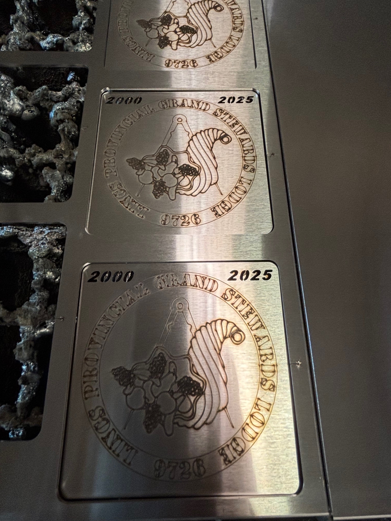 As a permanent reminder of the evening Pete got the help of his friend and fellow Freemason Mark Hooton to make commemorative drinks coasters, with a copy being given to all those present. Pete said: “Mark was kind enough to find the time to use his laser-cutting equipment to create the coasters, even though I know how busy he is with his Cymarc engineering business. I did the final fettling to finish the job.” A picture of the coasters and Pete doing the finishing are both shown below.