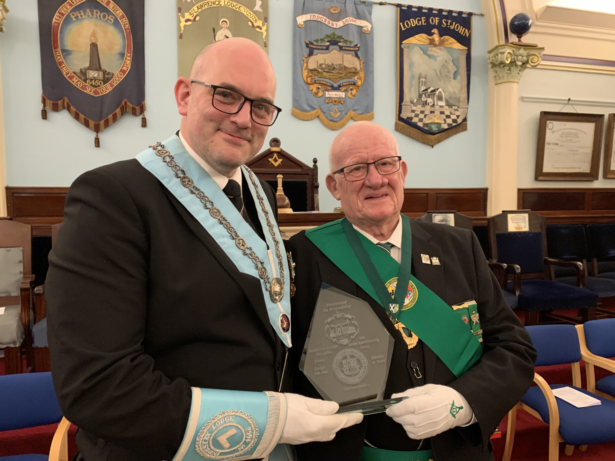 Industry Lodge has a strong association with Scots Lodge Stivenstoune Thistle and Rose Number 169, whose members presented a glass memento to record the occasion.