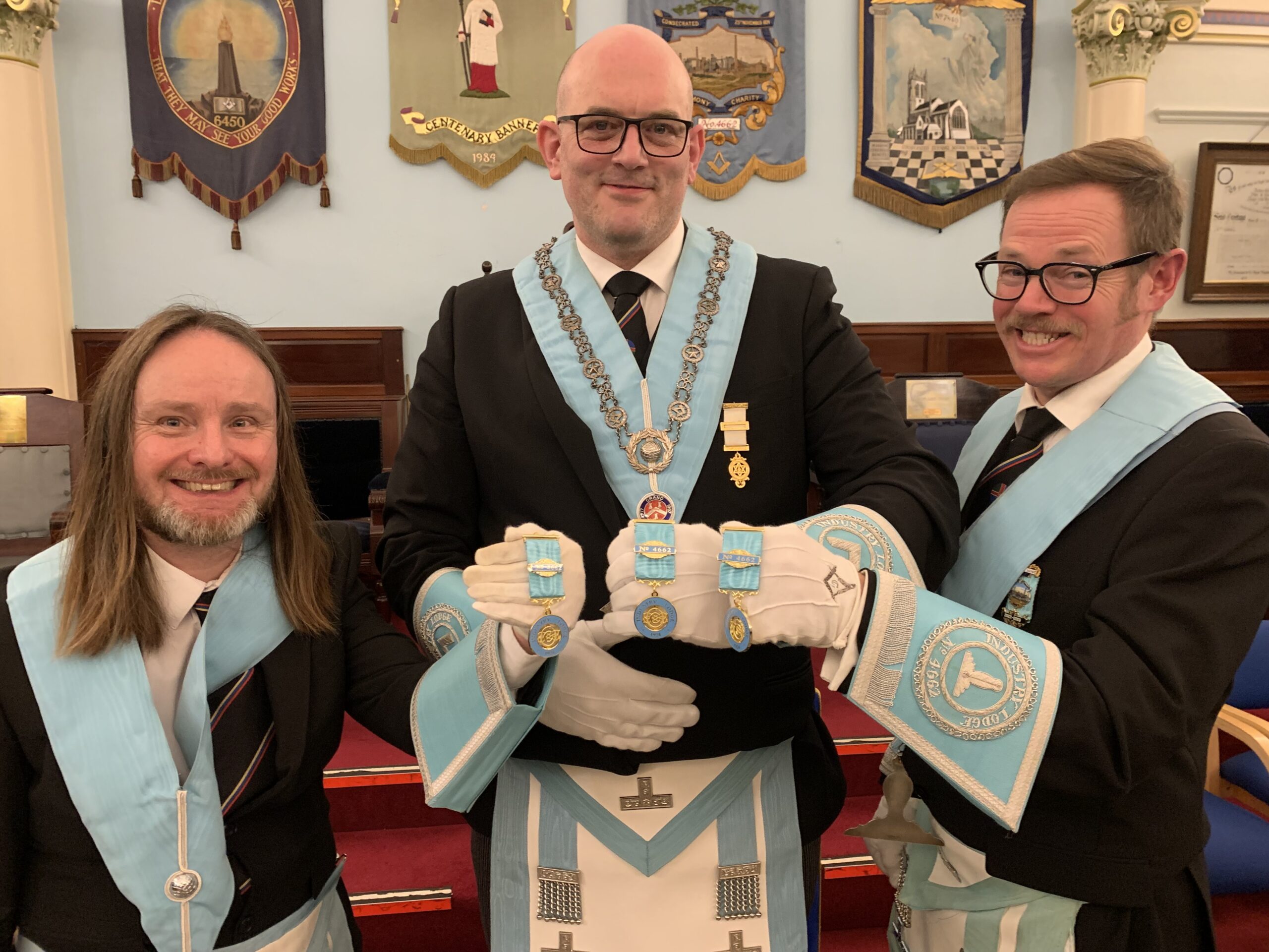 Lodge master Chris Tandy and his wardens John Robinson and Drew Hobley with the Lodge’s first Centenary jewels, seen below in close up.