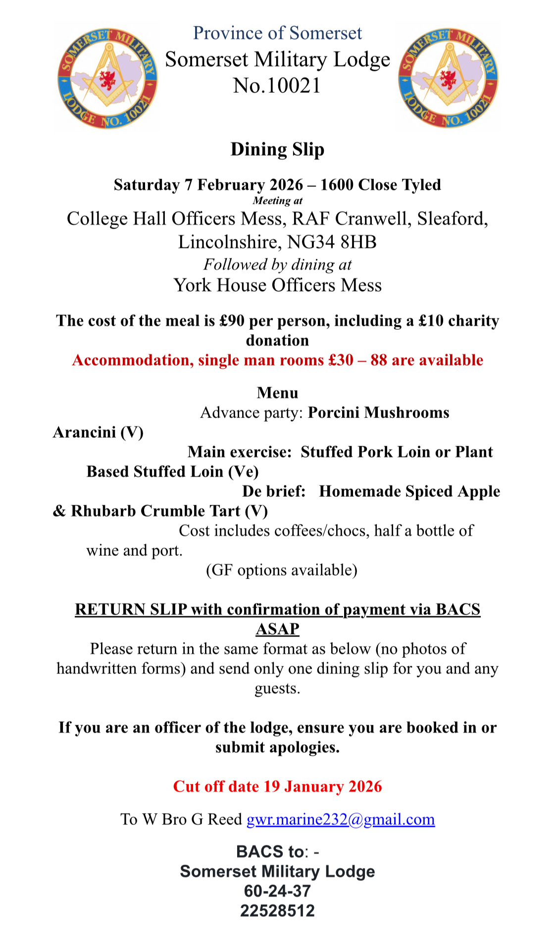 To make a booking email W Bro George Reed (email in the poster below) with your full name, dietary requirements, Masonic rank, car make, model, and registration, and confirm if you want overnight accommodation. Put in the same details for any guests. Payment details are in the poster.