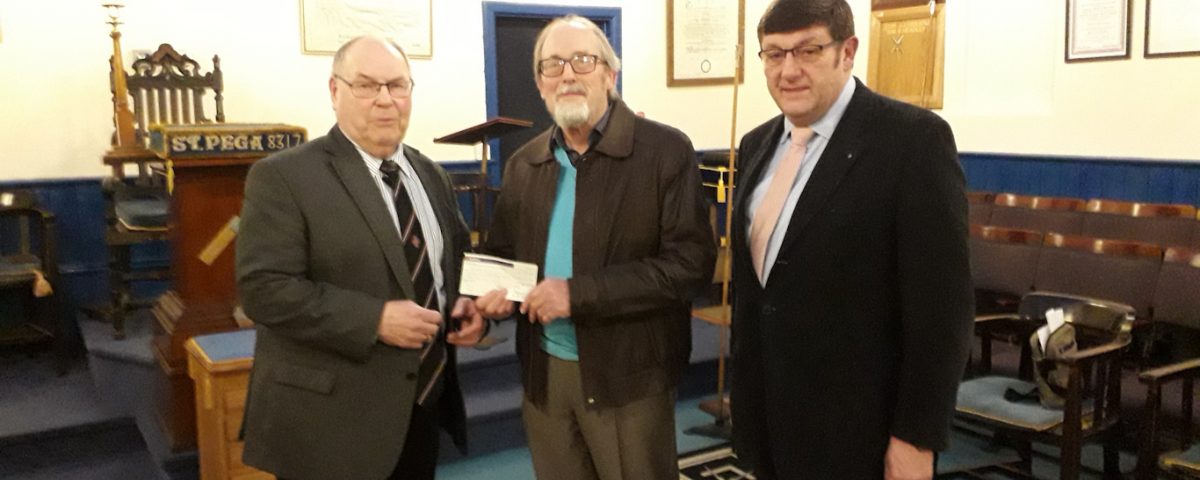 W. Bro. C. Hayes with W. Bro. D. Headley are seen presenting a cheque for £750 to Geoff Whittle from Age Concern. The money will go towards Age Concern Market Deeping’s ‘Special Appeal for a new Minibus’.