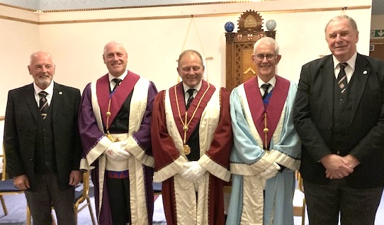 Karl Fido gets a big hand for getting the red robe and going into the Chair of Z in Lincoln-based Ermine Chapter at a ceremony attended by the Most Excellent Grand Superintendent Dave Wheeler who’s seen below with the Principals Karl, Dave Dernley, and Malcolm Batey.